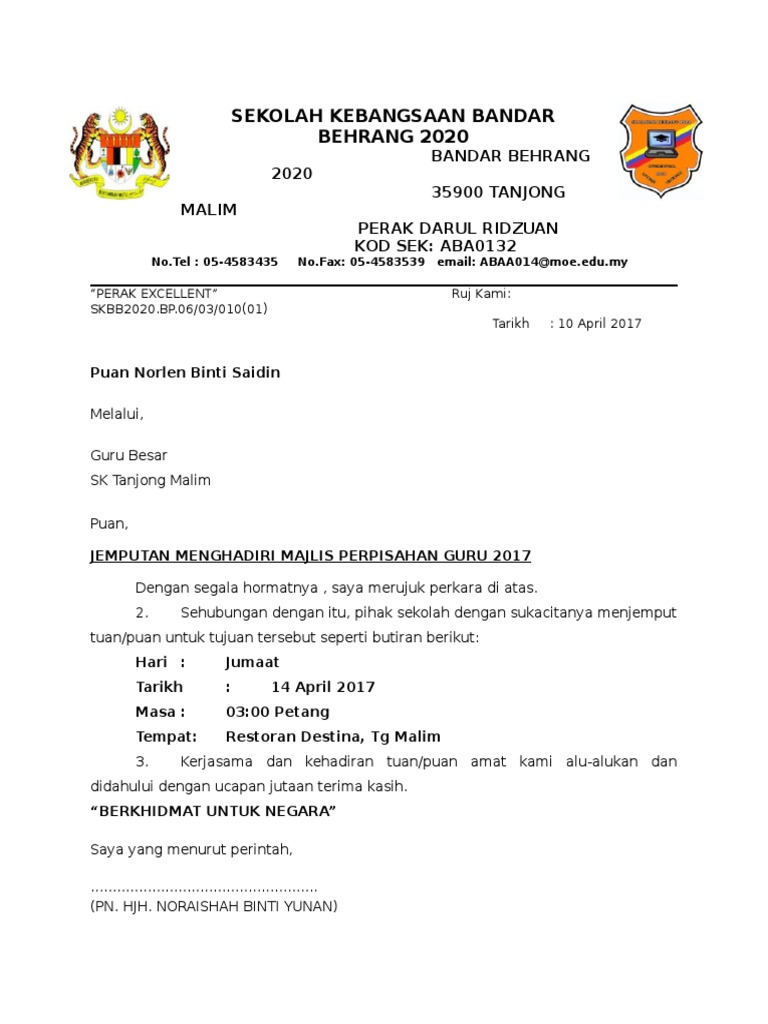 Contoh Surat Jemputan Ke Majlis Perpisahan Guru